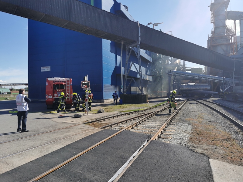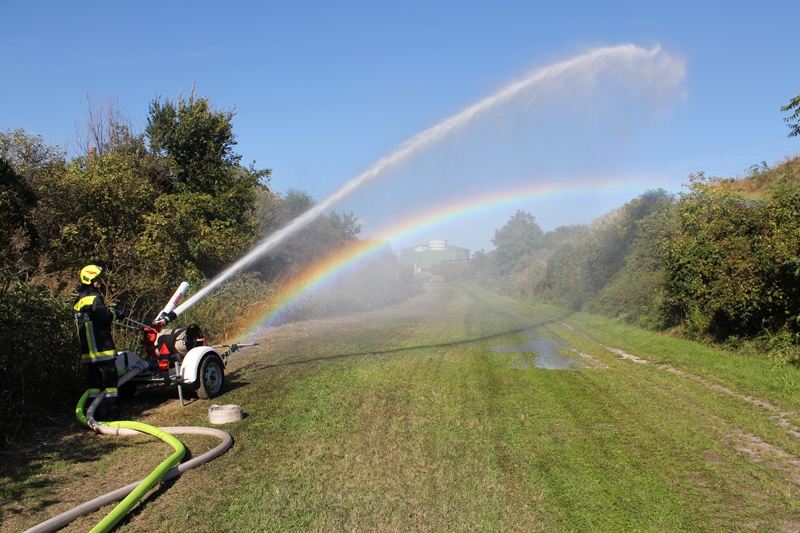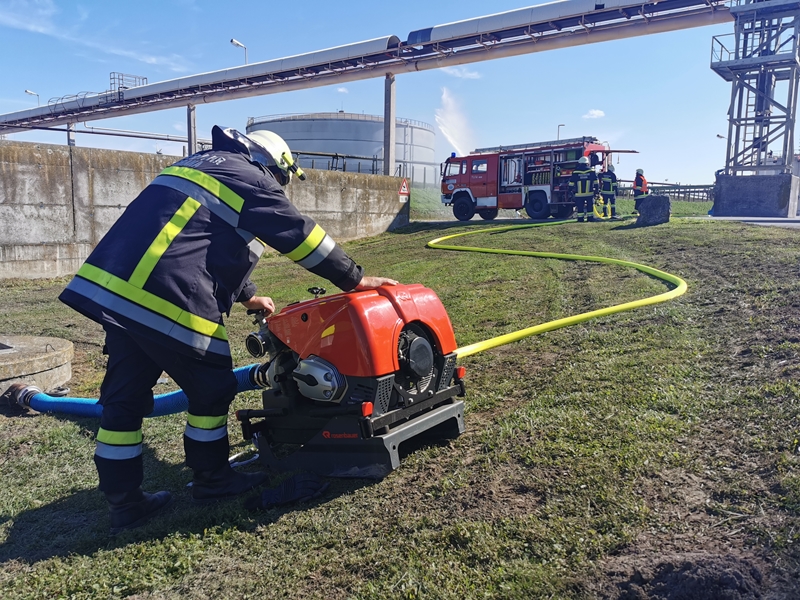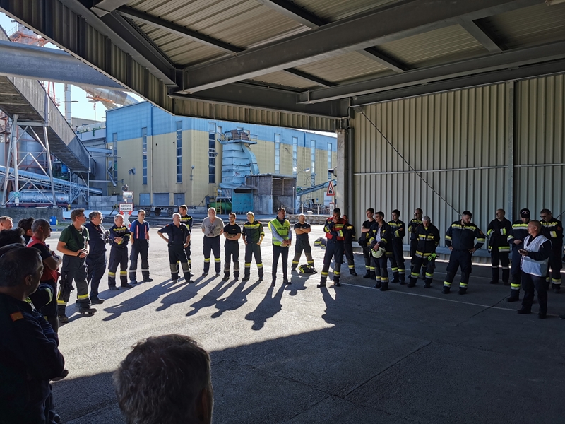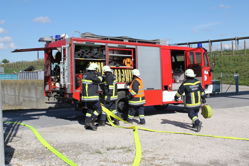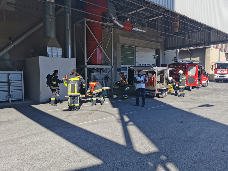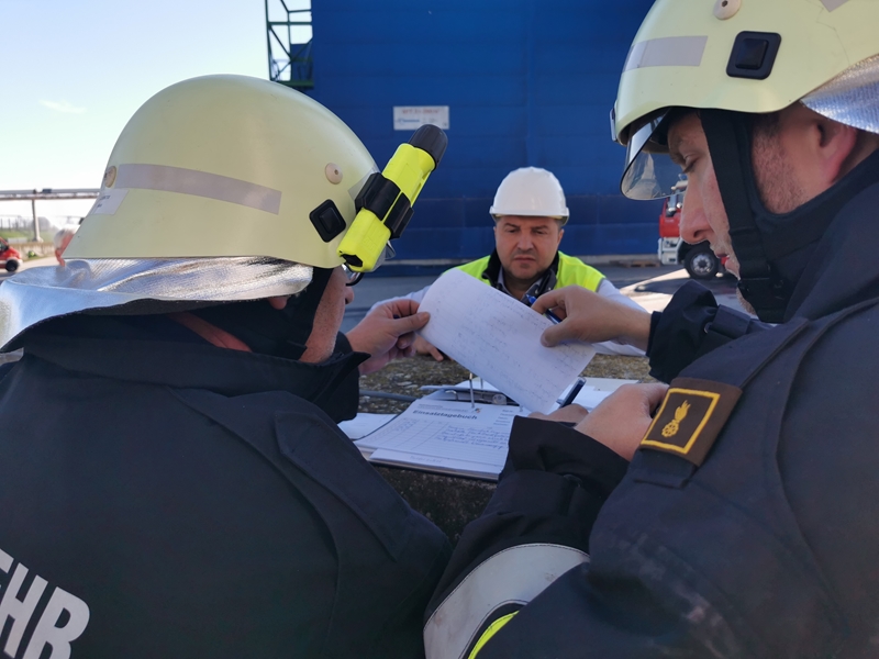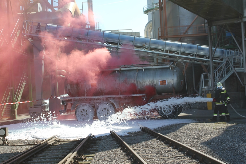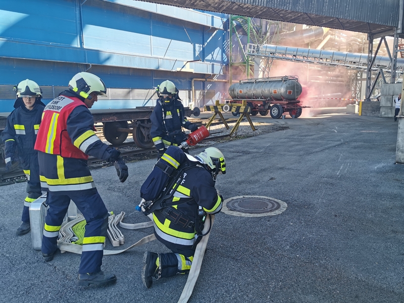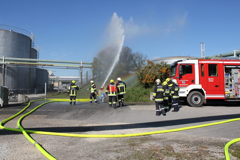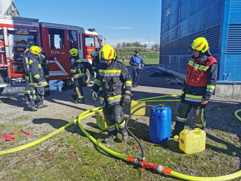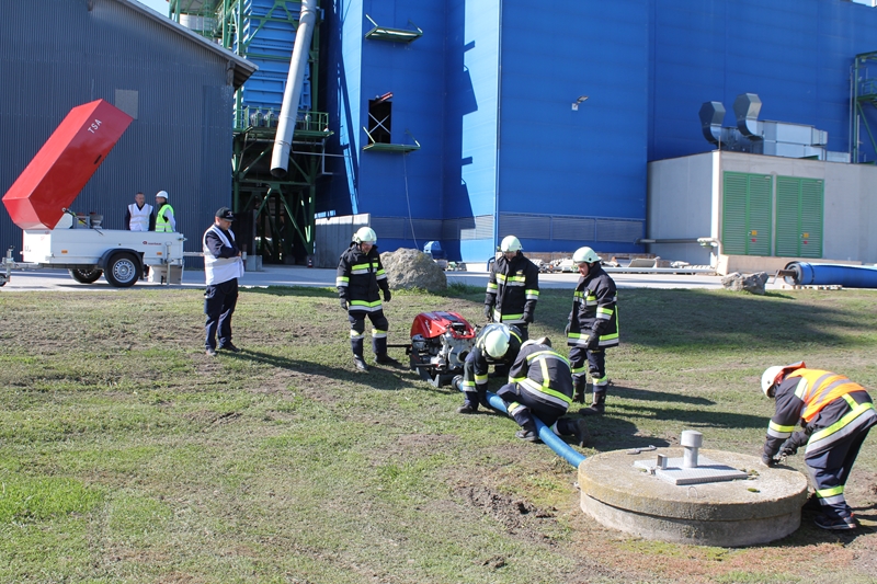 Gemeinsam wurde von der Werksfeuerwehr und weiteren sieben Feuerwehren die Brandbekämpfung geübt. Die Wasserversorgung wurde über das Nutzwassernetz des Betriebes sowie über den Rußbach und das Regenwasserbecken der Kläranlage sichergestellt. Zum Einsatz kamen auch drei Wasserwerfer sowie eine leistungsstarke Unterwasserpumpe.