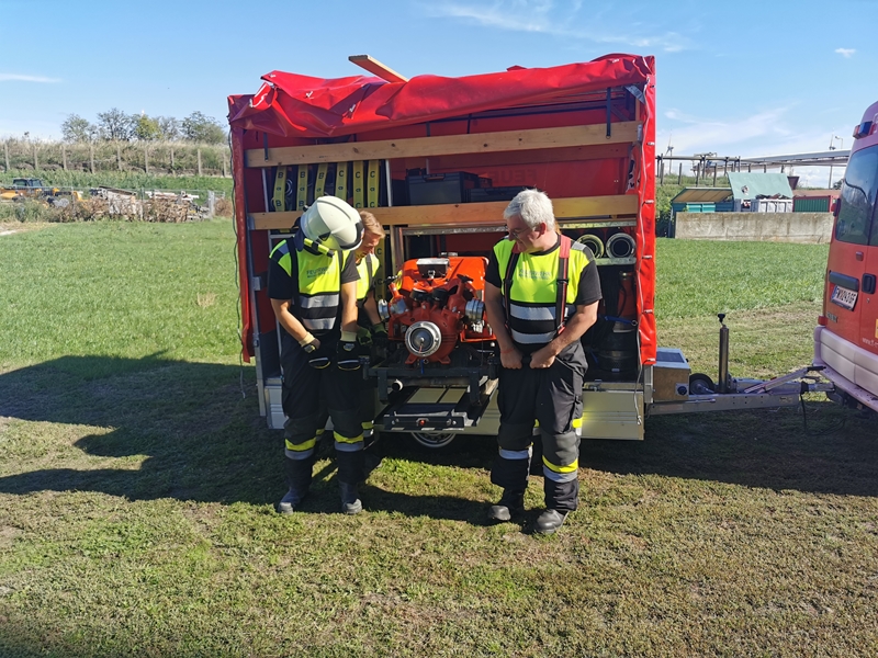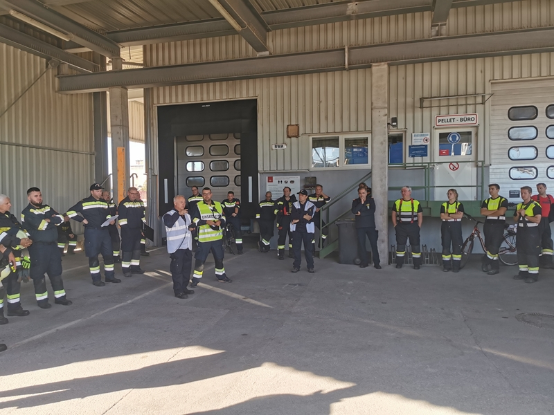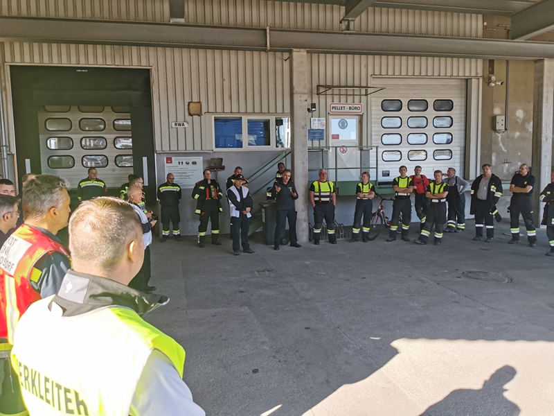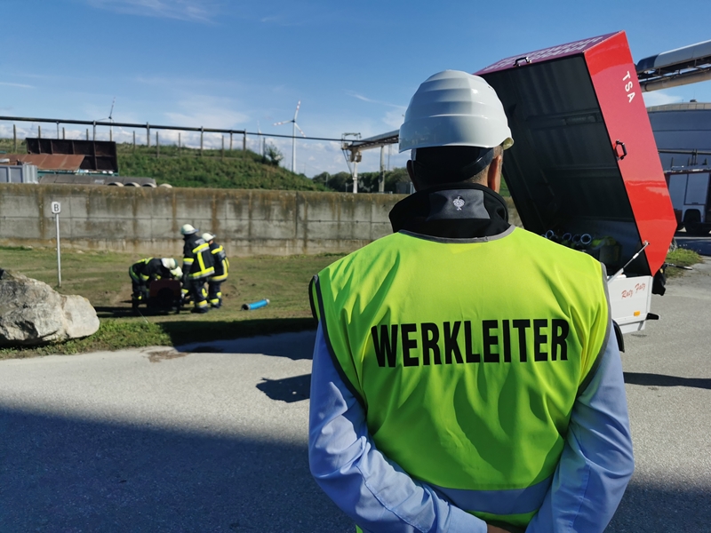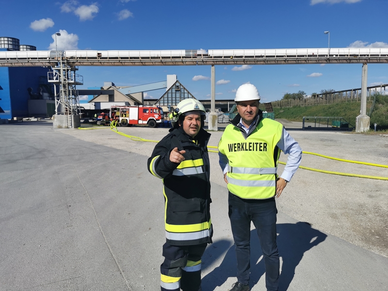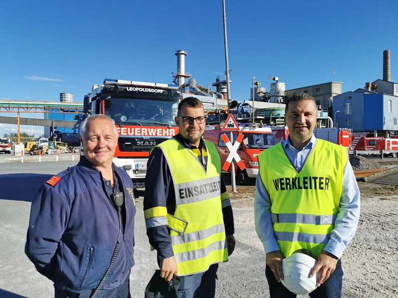 Werksleiter Elvis Makic, Abschnittsfeuerwehrkommandant Brandrat Engelbert Herney und Abschnittsfeuerwehrkommandantstellvertreter Abschnittsbrandinspektor Leopold Brandstetter sowie Unterabschnittskommandant Harald Hrabal beobachteten die Feuerwehren bei ihren Arbeiten.